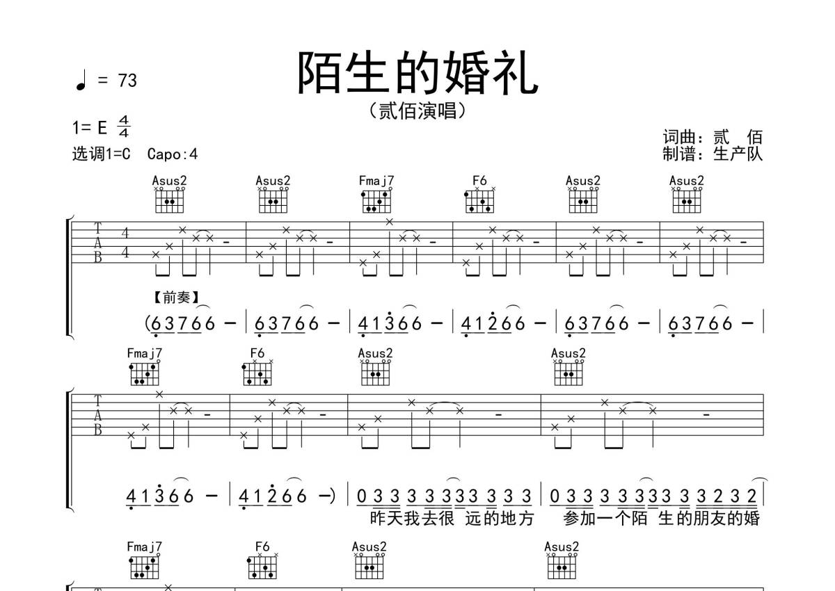 《陌生的婚礼》是贰佰演唱的一首歌曲,拍号为4/4拍,歌曲速度为每分钟73拍,本吉他谱采用的是C调指法编配,变调夹4品弹奏即为原调,当然也可以根据自己的音域改变变调夹位置,或者通过改变和弦调性,以方便自己弹奏,这份吉他谱共有四张高清图谱,图谱由 @生产队 编配上传,图谱使用六线谱编配,包含吉他和弦指法、简谱以及歌词部分,使用这份陌生的婚礼吉他谱,可以让你更加方便地掌握这首歌曲的弹唱技巧,快来尝试吧。