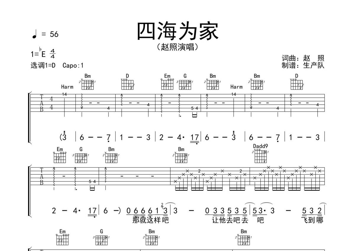 赵照《四海为家》吉他谱 - D调弹唱六线谱