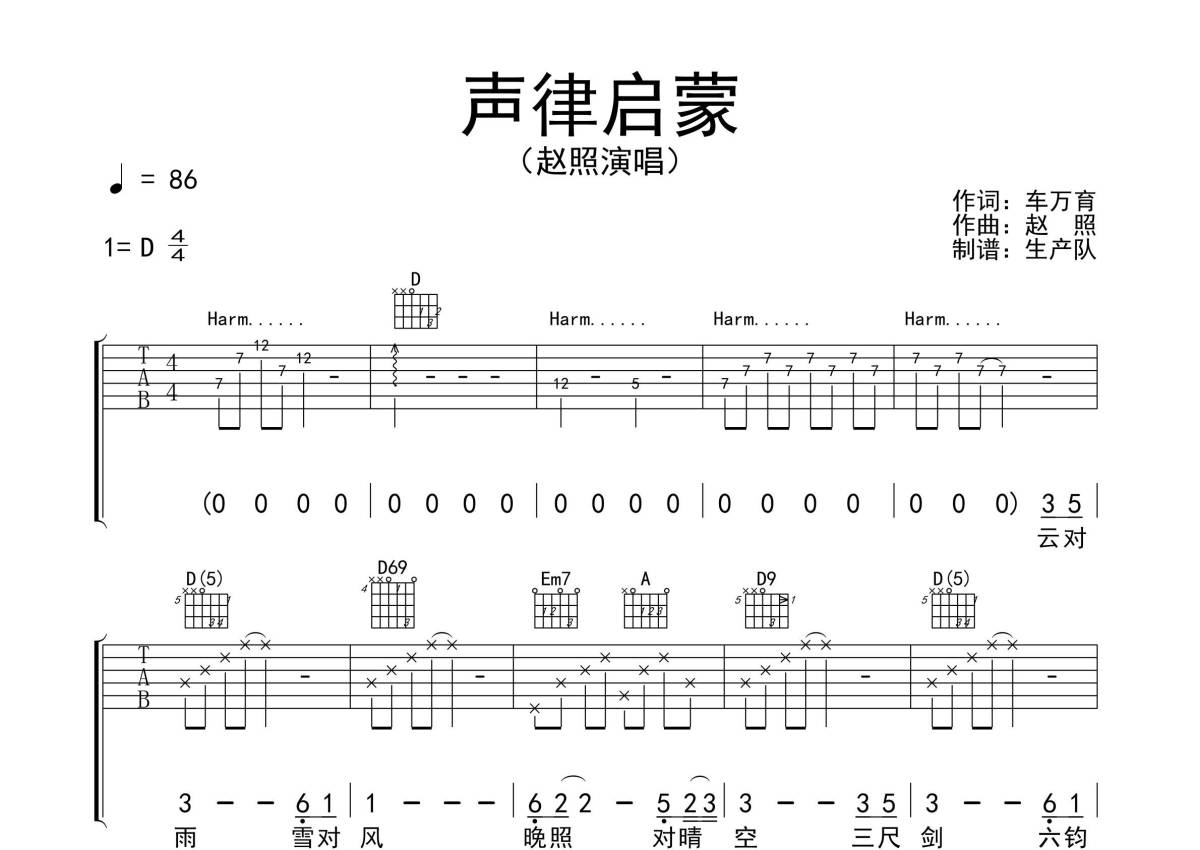 赵照《声律启蒙》吉他谱 - D调弹唱六线谱