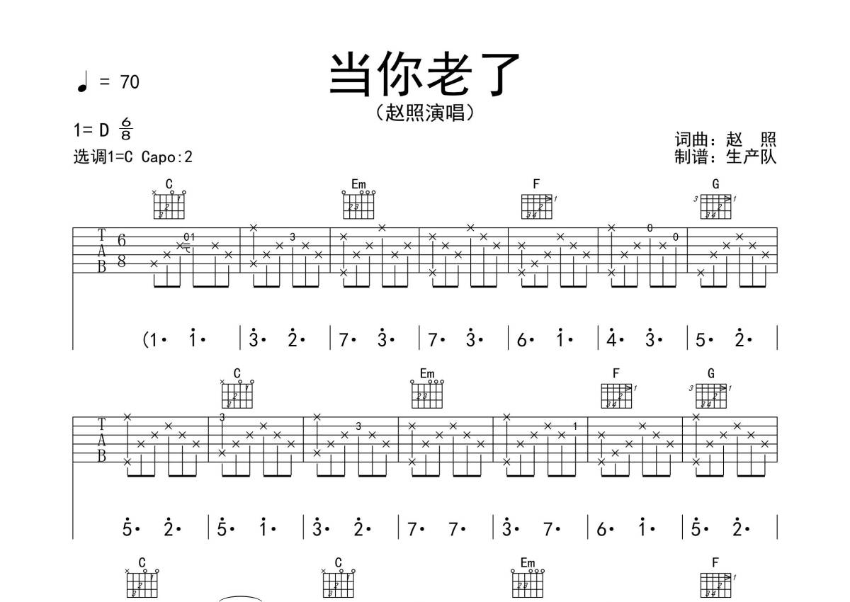 《当你老了》是赵照演唱的一首歌曲,拍号为6/8拍,歌曲速度为每分钟70拍,歌曲原调为D调,但由于原调指法比较难,为了方便弹奏,本吉他谱采用的是C调指法编配,变调夹2品弹奏即为原调,当然也可以根据自己的音域改变变调夹位置,或者通过改变和弦调性,以方便自己弹奏,这份吉他谱共有四张高清图谱,图谱由 @生产队 编配上传,图谱使用六线谱编配,包含吉他和弦指法、简谱以及歌词部分,使用这份当你老了吉他谱,可以让你更加方便地掌握这首歌曲的弹唱技巧,快来尝试吧。