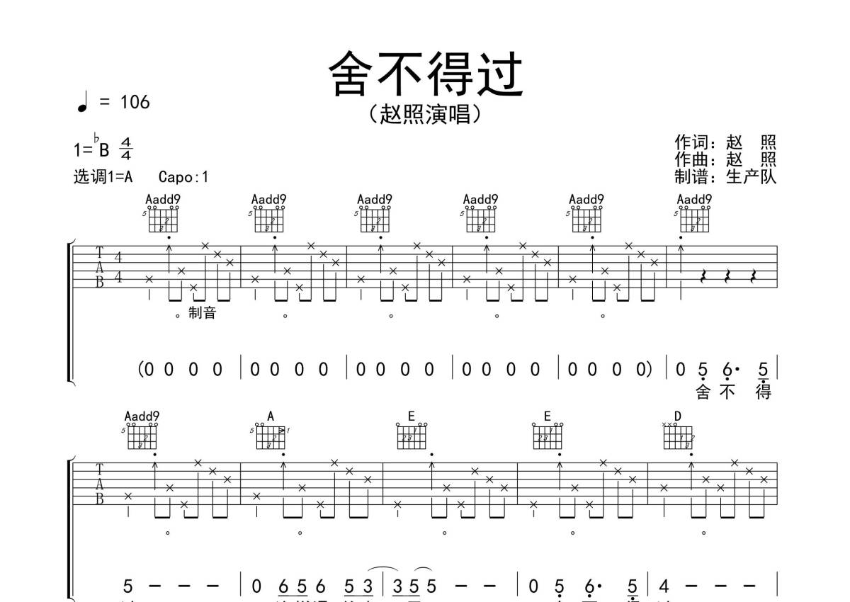 赵照《舍不得过》吉他谱 - A调弹唱六线谱