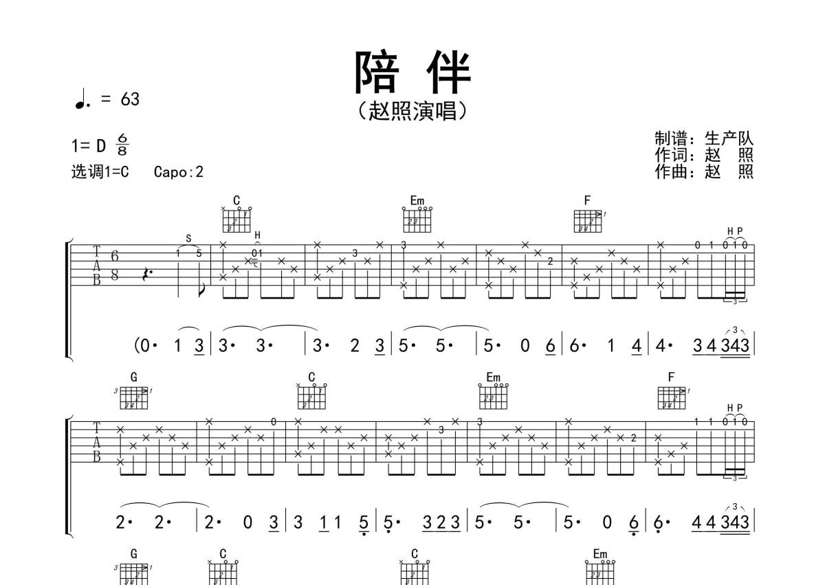 赵照《陪伴》吉他谱 - C调弹唱六线谱