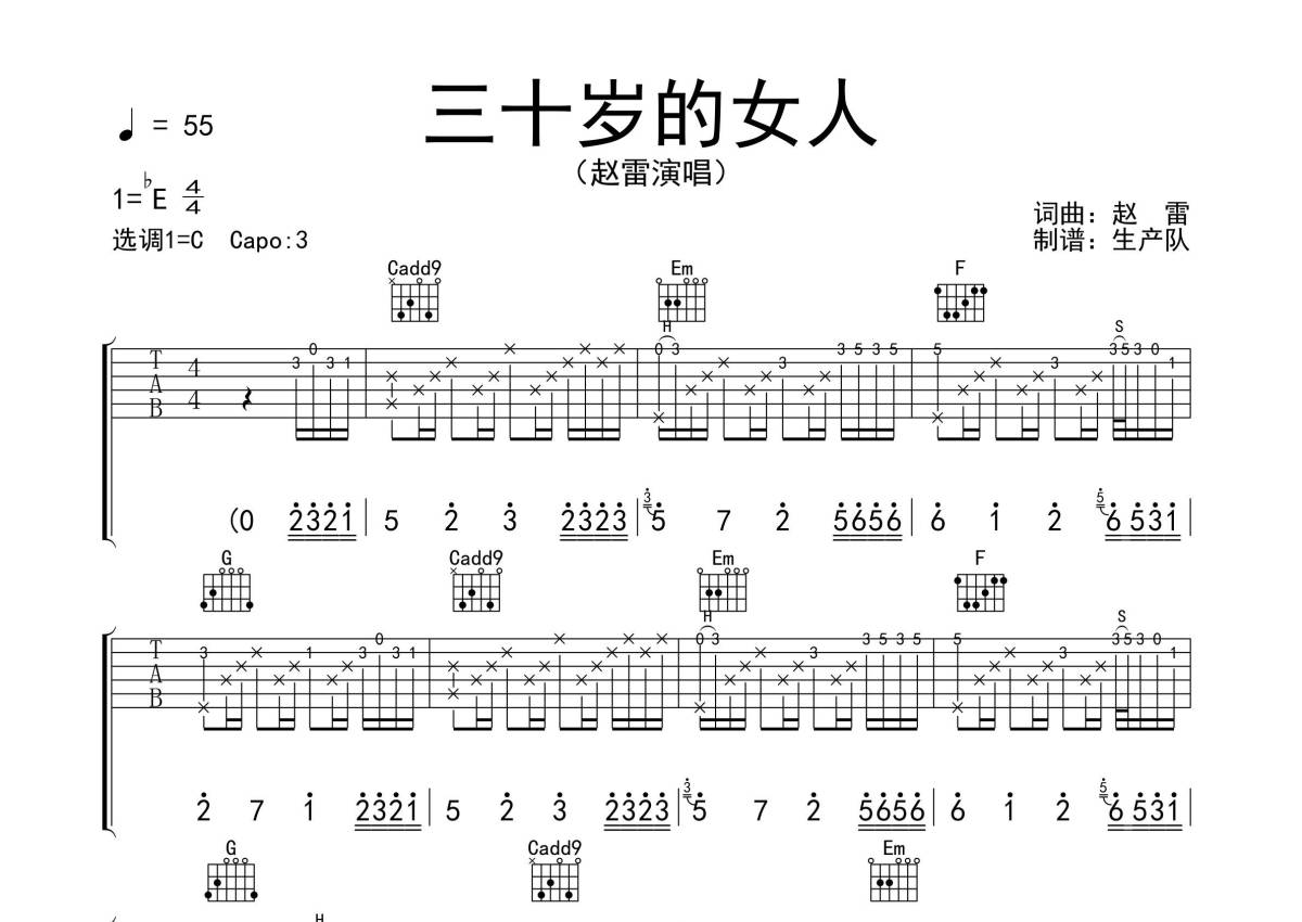 《三十岁的女人》是赵雷演唱的一首歌曲,拍号为4/4拍,歌曲速度为每分钟55拍,歌曲原调为Eb调,但由于原调指法比较难,为了方便弹奏,本吉他谱采用的是C调指法编配,变调夹3品弹奏即为原调,当然也可以根据自己的音域改变变调夹位置,或者通过改变和弦调性,以方便自己弹奏,这份吉他谱共有四张高清图谱,图谱由 @生产队 编配上传,图谱使用六线谱编配,包含吉他和弦指法、简谱以及歌词部分,使用这份三十岁的女人吉他谱,可以让你更加方便地掌握这首歌曲的弹唱技巧,快来尝试吧。