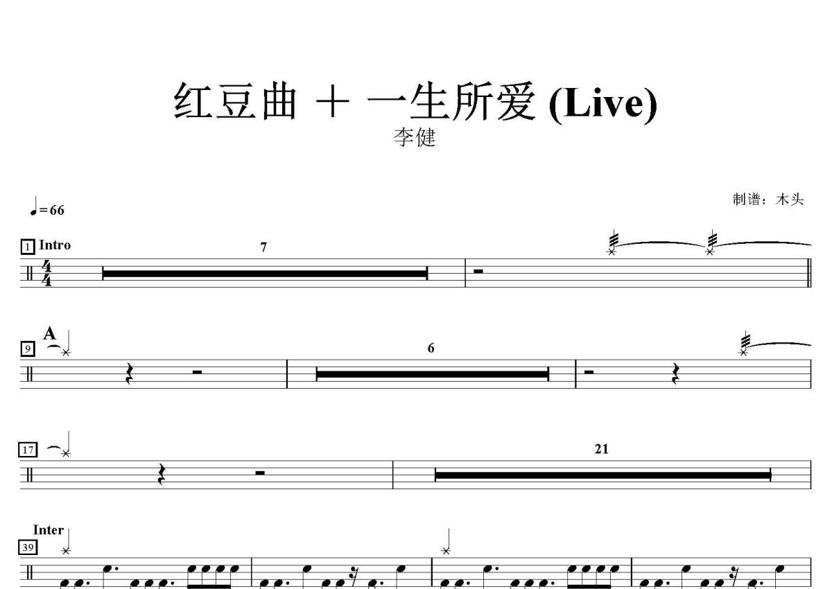 李健《红豆曲 + 一生所爱》鼓谱 - 架子鼓谱