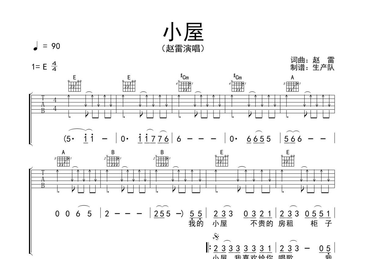 赵雷《小屋》吉他谱 - E调弹唱六线谱