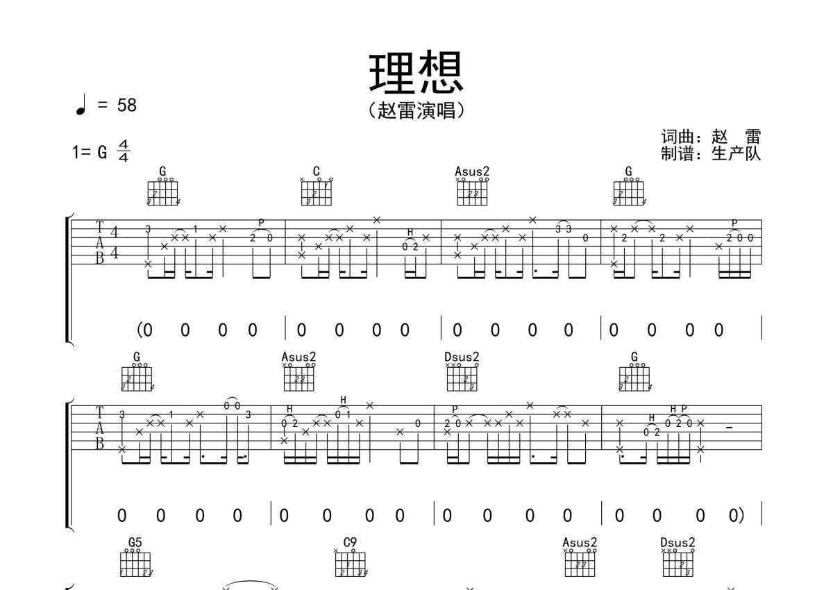 赵雷《理想》吉他谱 - G调弹唱六线谱