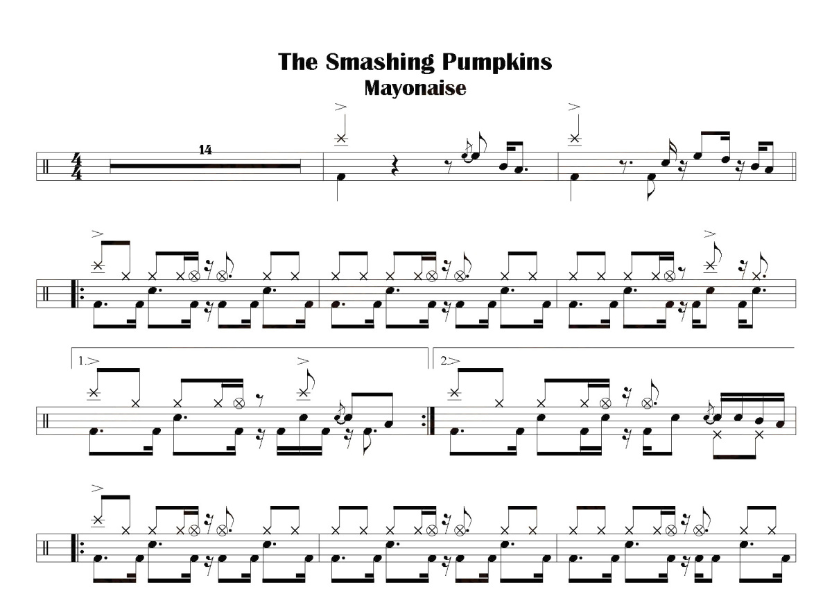 《Mayonaise》是Smashing Pumpkins演唱的一首歌曲,这份鼓谱共有三张高清图谱,图谱由 @打鼓谱 编配上传,图谱使用五线谱编配,使用这份Mayonaise架子鼓谱,你将能够轻松地敲打出这首Smashing Pumpkins的Mayonaise,快来尝试吧。《Mayonaise》现场版。碎南瓜乐队组建于1988年,是一支美国男子乐队,成员有主唱兼吉他手billy corgan james iha(吉他) d'arcy wretzky(贝司) jimmy chamberlin(鼓手),乐队风格是alternative pop/rock (另类流行/摇滚) 。