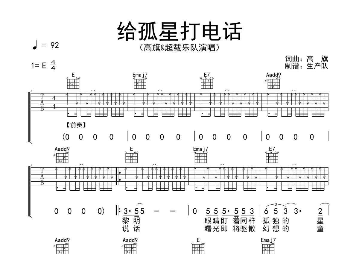 超载乐队/高旗《给孤星打电话》吉他谱 - E调弹唱六线谱