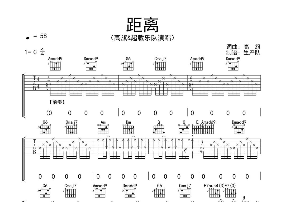 《距离》是超载乐队/高旗演唱的一首歌曲,拍号为4/4拍,歌曲速度为每分钟58拍,歌曲原调为C调,本吉他谱采用的是C调指法编配,演奏时不需要使用变调夹即为原调,这份吉他谱共有三张高清图谱,图谱由 @生产队 编配上传,图谱使用六线谱编配,包含吉他和弦指法、简谱以及歌词部分,使用这份距离吉他谱,可以让你更加方便地掌握这首歌曲的弹唱技巧,快来尝试吧。