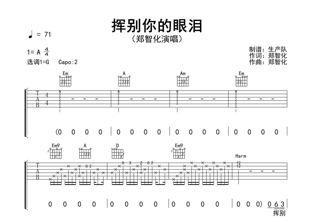 《挥别你的眼泪》是郑智化演唱的一首歌曲,拍号为4/4拍,歌曲速度为每分钟71拍,歌曲原调为A调,但由于原调指法比较难,为了方便弹奏,本吉他谱采用的是G调指法编配,变调夹2品弹奏即为原调,当然也可以根据自己的音域改变变调夹位置,或者通过改变和弦调性,以方便自己弹奏,这份吉他谱共有三张高清图谱,图谱由 @生产队 编配上传,图谱使用六线谱编配,包含吉他和弦指法、简谱以及歌词部分,使用这份挥别你的眼泪吉他谱,可以让你更加方便地掌握这首歌曲的弹唱技巧,快来尝试吧。