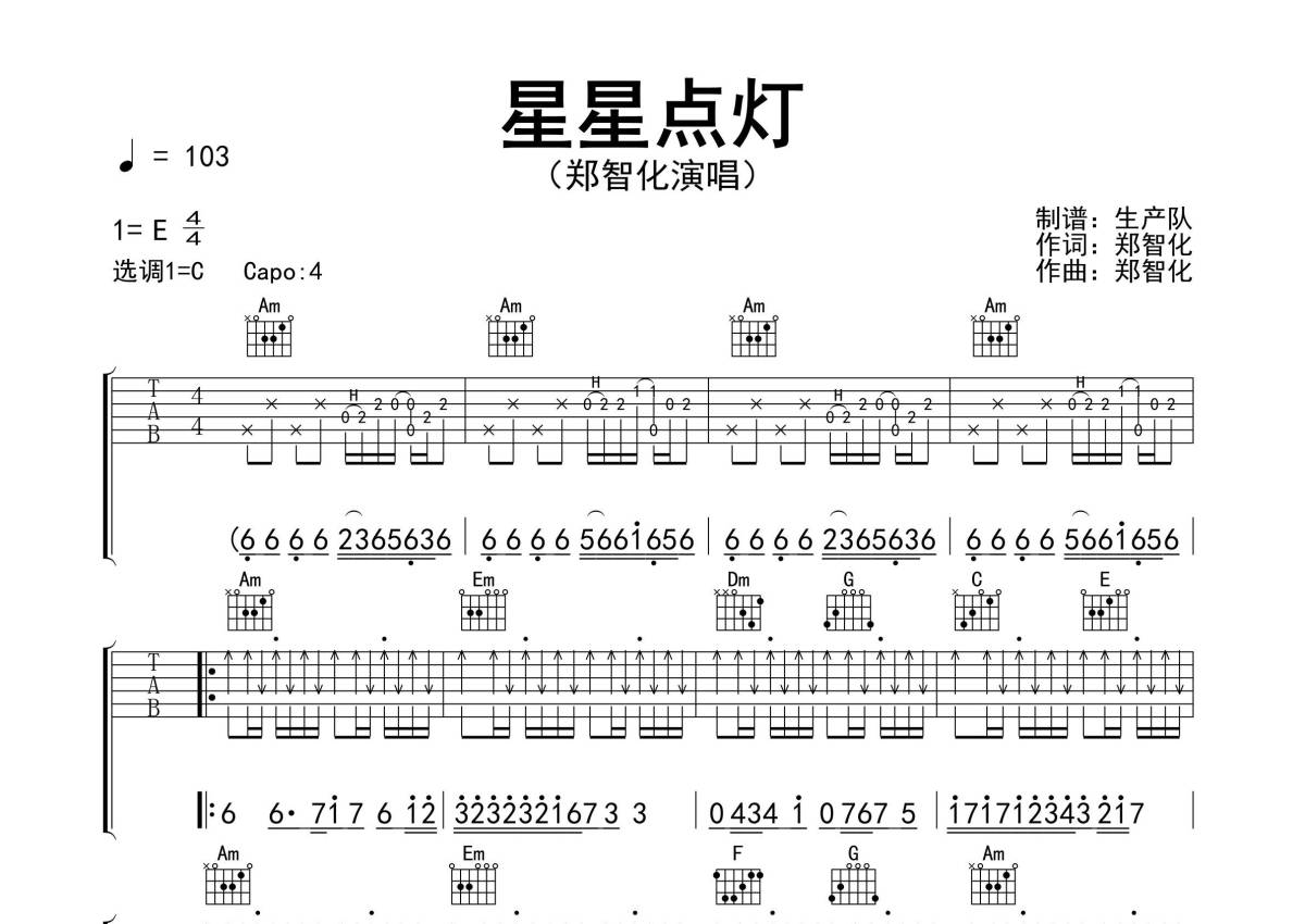 《星星点灯》是郑智化演唱的一首歌曲,拍号为4/4拍,歌曲速度为每分钟103拍,歌曲原调为E调,但由于原调指法比较难,为了方便弹奏,本吉他谱采用的是C调指法编配,变调夹4品弹奏即为原调,当然也可以根据自己的音域改变变调夹位置,或者通过改变和弦调性,以方便自己弹奏,这份吉他谱共有四张高清图谱,图谱由 @生产队 编配上传,图谱使用六线谱编配,包含吉他和弦指法、简谱以及歌词部分,使用这份星星点灯吉他谱,可以让你更加方便地掌握这首歌曲的弹唱技巧,快来尝试吧。