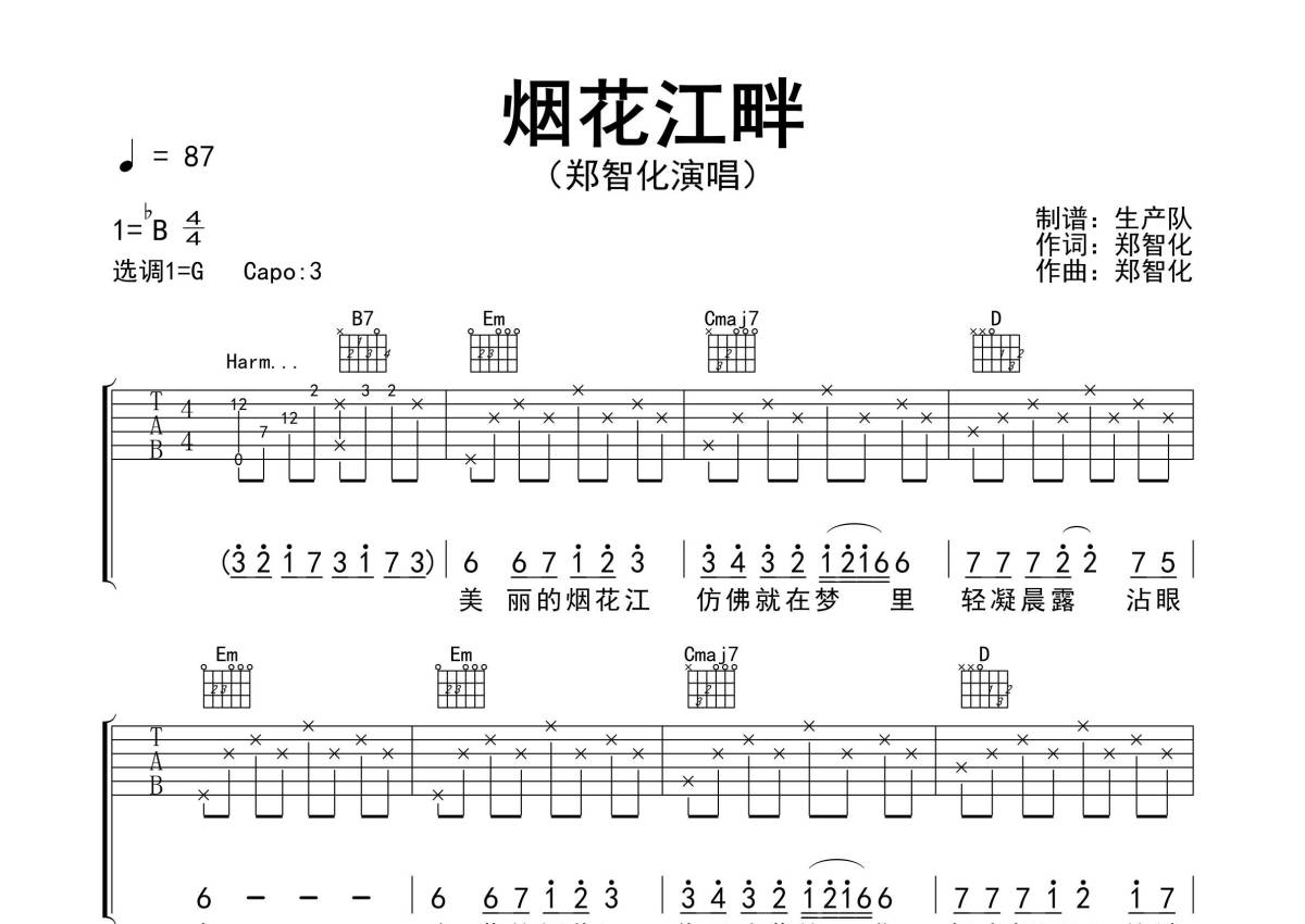 《烟花江畔》是郑智化演唱的一首歌曲,拍号为4/4拍,歌曲速度为每分钟87拍,歌曲原调为Bb调,但由于原调指法比较难,为了方便弹奏,本吉他谱采用的是G调指法编配,变调夹3品弹奏即为原调,当然也可以根据自己的音域改变变调夹位置,或者通过改变和弦调性,以方便自己弹奏,这份吉他谱共有三张高清图谱,图谱由 @生产队 编配上传,图谱使用六线谱编配,包含吉他和弦指法、简谱以及歌词部分,使用这份烟花江畔吉他谱,可以让你更加方便地掌握这首歌曲的弹唱技巧,快来尝试吧。