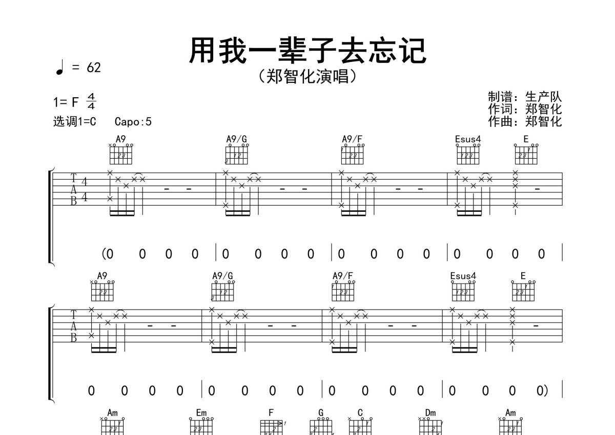 郑智化《用我一辈子去忘记》吉他谱 - C调弹唱六线谱