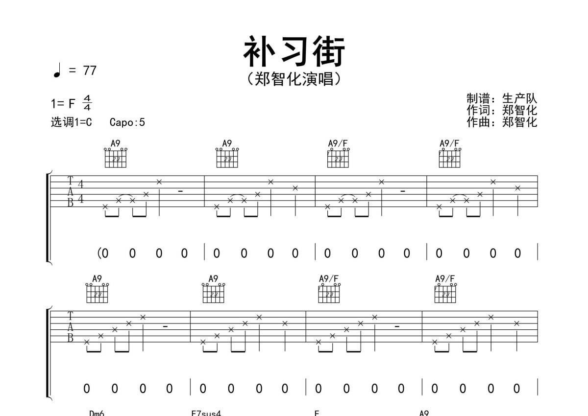 《补习街》是郑智化演唱的一首歌曲,拍号为4/4拍,歌曲速度为每分钟77拍,歌曲原调为F调,但由于原调指法比较难,为了方便弹奏,本吉他谱采用的是C调指法编配,变调夹5品弹奏即为原调,当然也可以根据自己的音域改变变调夹位置,或者通过改变和弦调性,以方便自己弹奏,这份吉他谱共有四张高清图谱,图谱由 @生产队 编配上传,图谱使用六线谱编配,包含吉他和弦指法、简谱以及歌词部分,使用这份补习街吉他谱,可以让你更加方便地掌握这首歌曲的弹唱技巧,快来尝试吧。