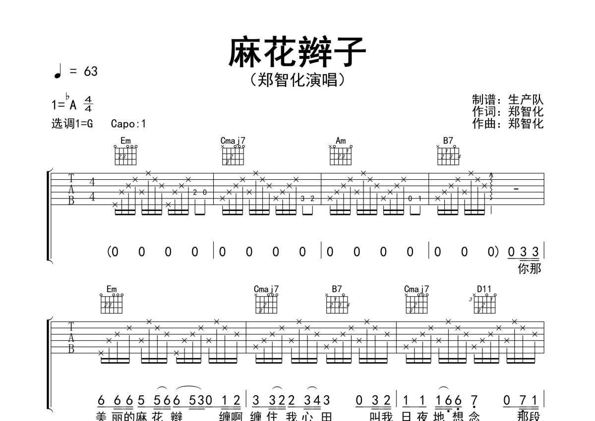 《麻花辫子》是郑智化演唱的一首歌曲,拍号为4/4拍,歌曲速度为每分钟63拍,歌曲原调为Ab调,但由于原调指法比较难,为了方便弹奏,本吉他谱采用的是G调指法编配,变调夹1品弹奏即为原调,当然也可以根据自己的音域改变变调夹位置,或者通过改变和弦调性,以方便自己弹奏,这份吉他谱共有两张高清图谱,图谱由 @生产队 编配上传,图谱使用六线谱编配,包含吉他和弦指法、简谱以及歌词部分,使用这份麻花辫子吉他谱,可以让你更加方便地掌握这首歌曲的弹唱技巧,快来尝试吧。