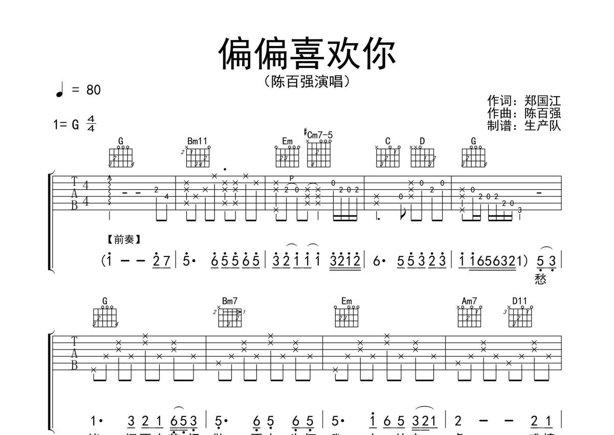 陈百强《偏偏喜欢你》吉他谱 - G调弹唱六线谱