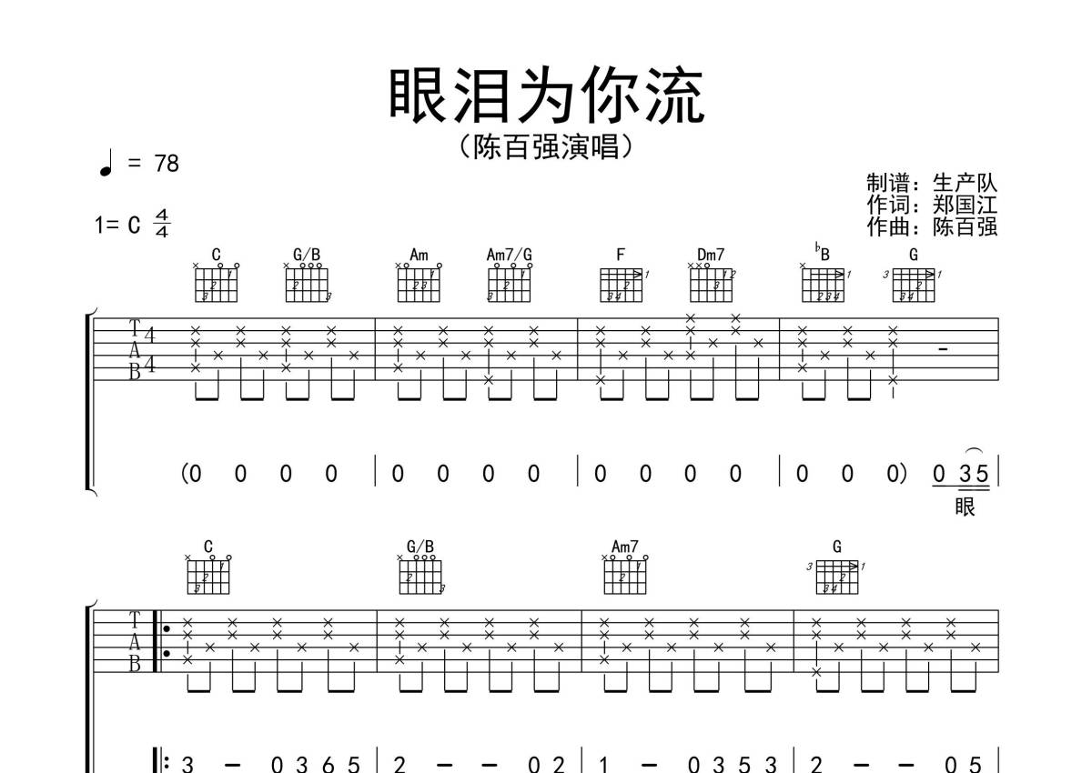 《眼泪为你流》是陈百强演唱的一首歌曲,拍号为4/4拍,歌曲速度为每分钟78拍,歌曲原调为C调,本吉他谱采用的是C调指法编配,演奏时不需要使用变调夹即为原调,这份吉他谱共有三张高清图谱,图谱由 @生产队 编配上传,图谱使用六线谱编配,包含吉他和弦指法、简谱以及歌词部分,使用这份眼泪为你流吉他谱,可以让你更加方便地掌握这首歌曲的弹唱技巧,快来尝试吧。