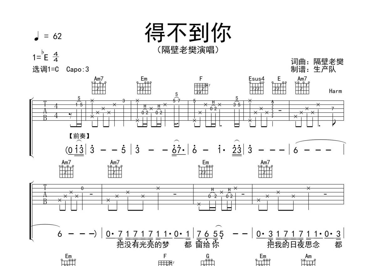 《得不到你》是隔壁老樊演唱的一首歌曲,拍号为4/4拍,歌曲速度为每分钟62拍,歌曲原调为Eb调,但由于原调指法比较难,为了方便弹奏,本吉他谱采用的是C调指法编配,变调夹3品弹奏即为原调,当然也可以根据自己的音域改变变调夹位置,或者通过改变和弦调性,以方便自己弹奏,这份吉他谱共有三张高清图谱,图谱由 @生产队 编配上传,图谱使用六线谱编配,包含吉他和弦指法、简谱以及歌词部分,使用这份得不到你吉他谱,可以让你更加方便地掌握这首歌曲的弹唱技巧,快来尝试吧。