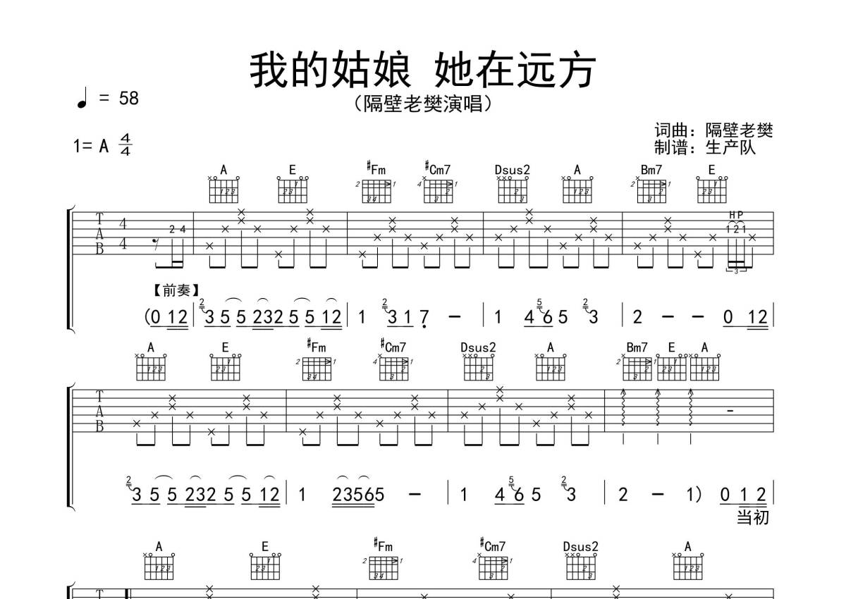 隔壁老樊《我的姑娘 她在远方》吉他谱 - A调弹唱六线谱