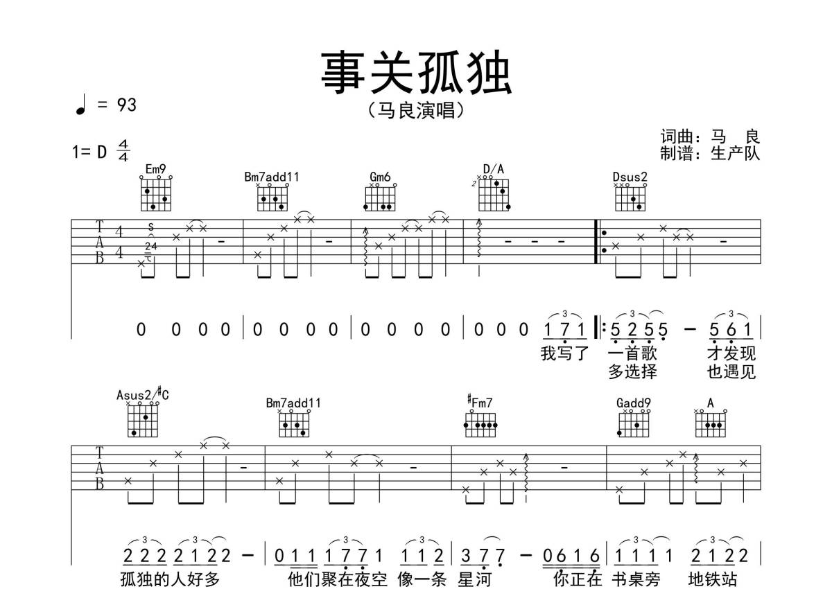 马良《事关孤独》吉他谱 - D调弹唱六线谱