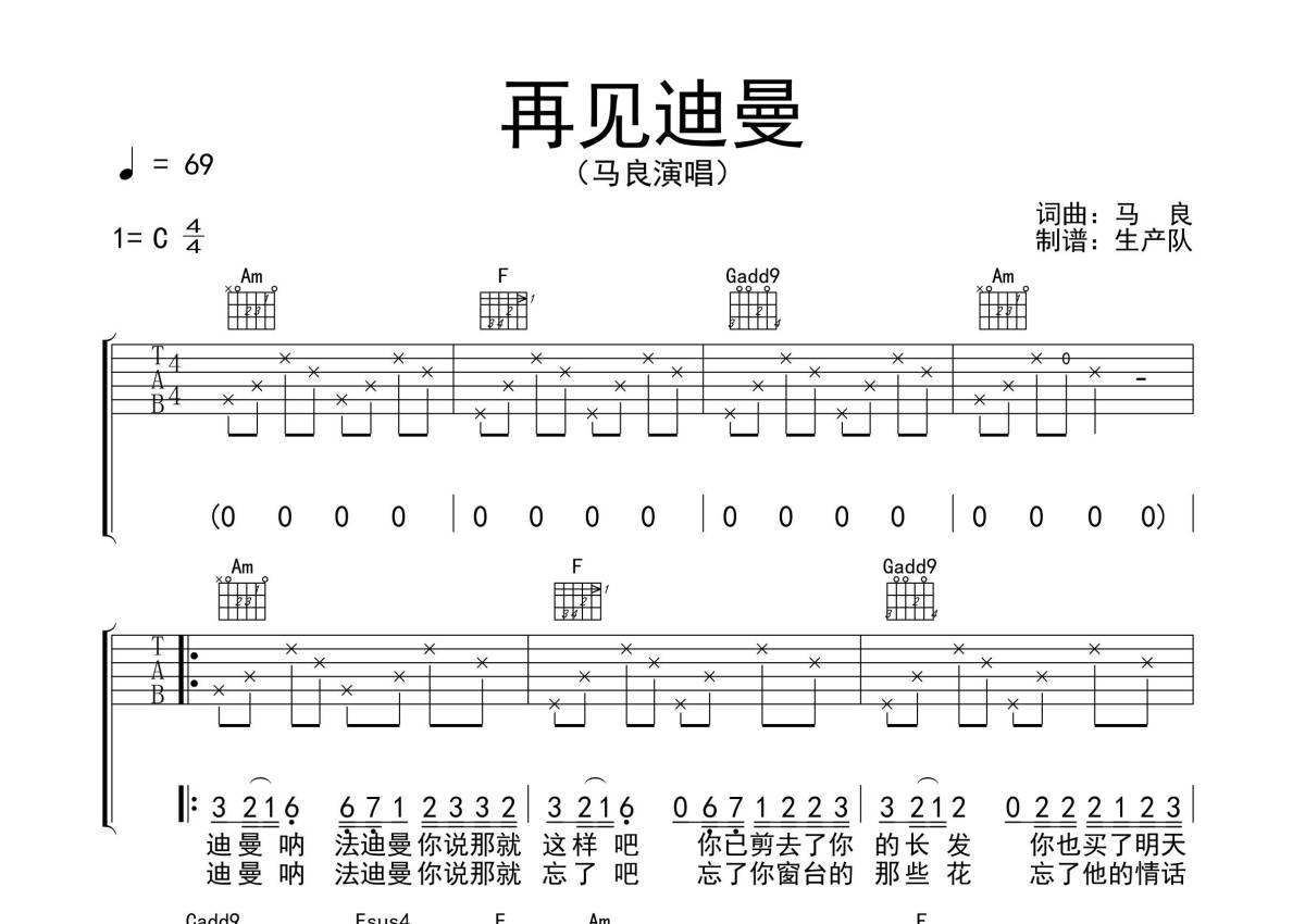 马良《再见迪曼》吉他谱 - C调弹唱六线谱