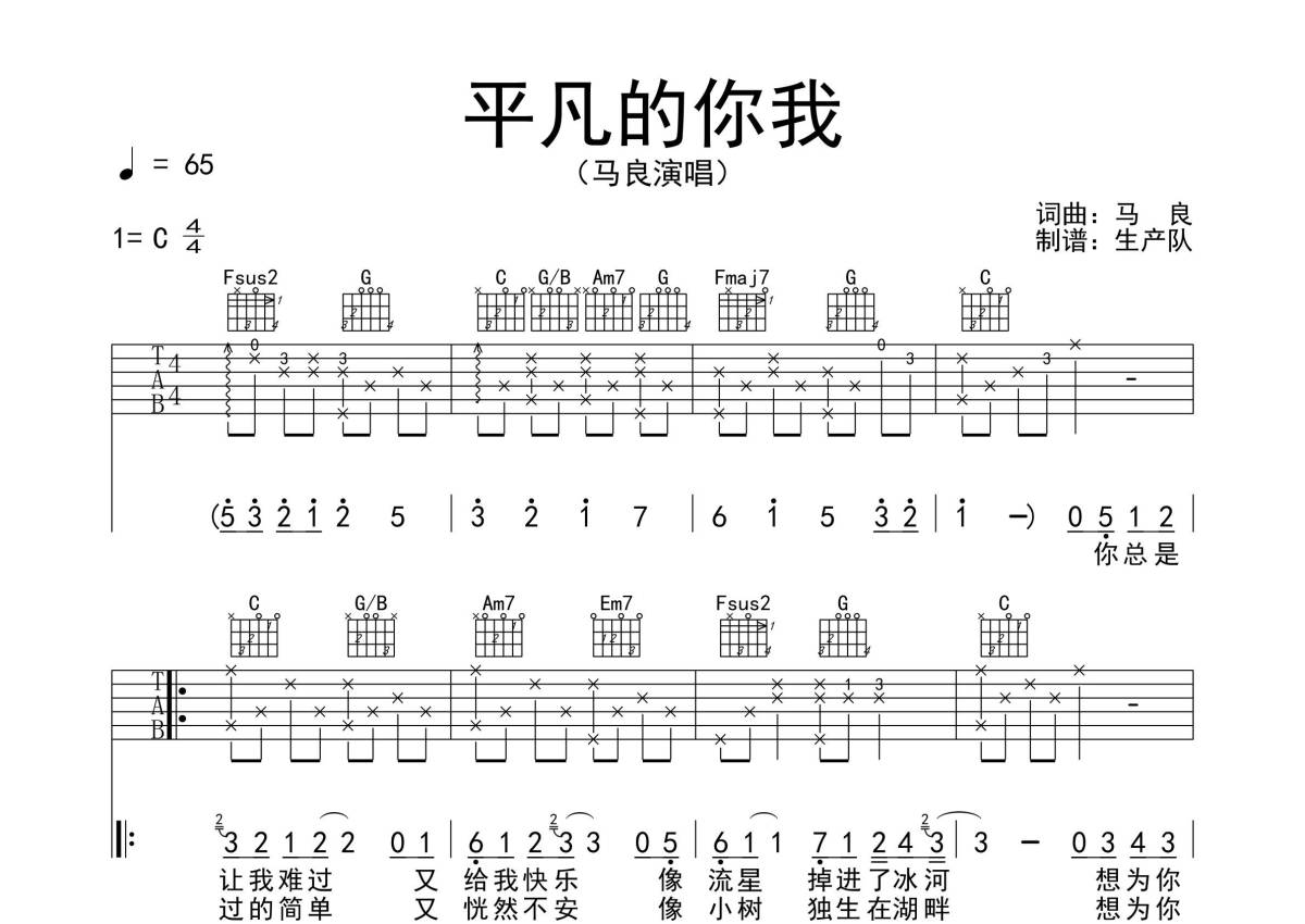 马良《平凡的你我》吉他谱 - C调弹唱六线谱