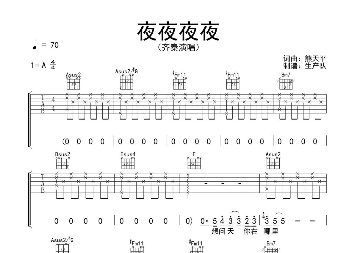 齐秦《夜夜夜夜》吉他谱 - A调弹唱六线谱