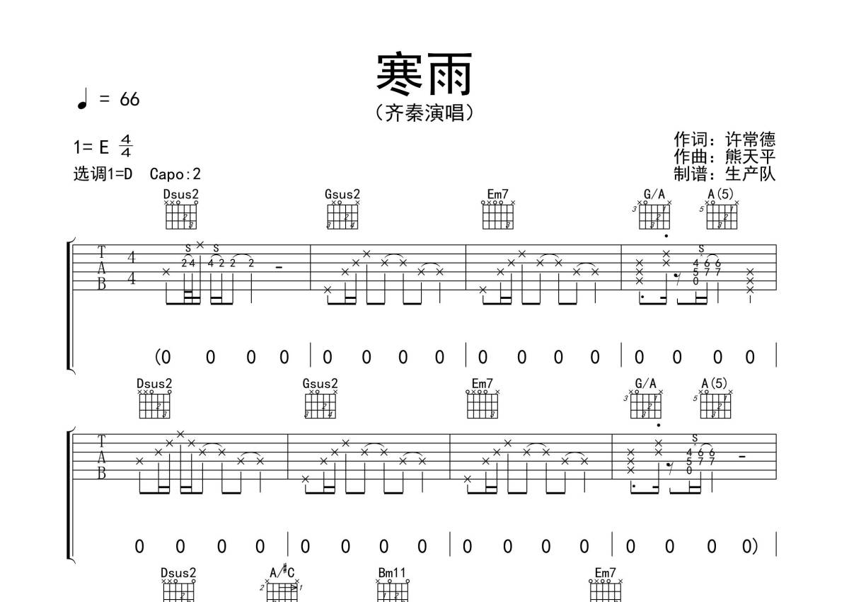 《寒雨》是齐秦演唱的一首歌曲,拍号为4/4拍,歌曲速度为每分钟66拍,歌曲原调为E调,但由于原调指法比较难,为了方便弹奏,本吉他谱采用的是D调指法编配,变调夹2品弹奏即为原调,当然也可以根据自己的音域改变变调夹位置,或者通过改变和弦调性,以方便自己弹奏,这份吉他谱共有四张高清图谱,图谱由 @生产队 编配上传,图谱使用六线谱编配,包含吉他和弦指法、简谱以及歌词部分,使用这份寒雨吉他谱,可以让你更加方便地掌握这首歌曲的弹唱技巧,快来尝试吧。