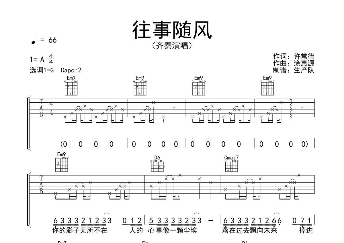 《往事随风》是齐秦演唱的一首歌曲,拍号为4/4拍,歌曲速度为每分钟66拍,歌曲原调为A调,但由于原调指法比较难,为了方便弹奏,本吉他谱采用的是G调指法编配,变调夹2品弹奏即为原调,当然也可以根据自己的音域改变变调夹位置,或者通过改变和弦调性,以方便自己弹奏,这份吉他谱共有三张高清图谱,图谱由 @生产队 编配上传,图谱使用六线谱编配,包含吉他和弦指法、简谱以及歌词部分,使用这份往事随风吉他谱,可以让你更加方便地掌握这首歌曲的弹唱技巧,快来尝试吧。