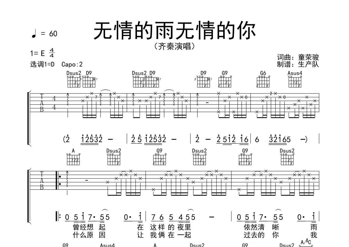 《无情的雨无情的你》是齐秦演唱的一首歌曲,拍号为4/4拍,歌曲速度为每分钟60拍,歌曲原调为E调,但由于原调指法比较难,为了方便弹奏,本吉他谱采用的是D调指法编配,变调夹2品弹奏即为原调,当然也可以根据自己的音域改变变调夹位置,或者通过改变和弦调性,以方便自己弹奏,这份吉他谱共有三张高清图谱,图谱由 @生产队 编配上传,图谱使用六线谱编配,包含吉他和弦指法、简谱以及歌词部分,使用这份无情的雨无情的你吉他谱,可以让你更加方便地掌握这首歌曲的弹唱技巧,快来尝试吧。