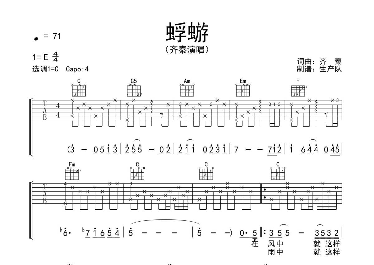 齐秦《蜉蝣》吉他谱 - C调弹唱六线谱
