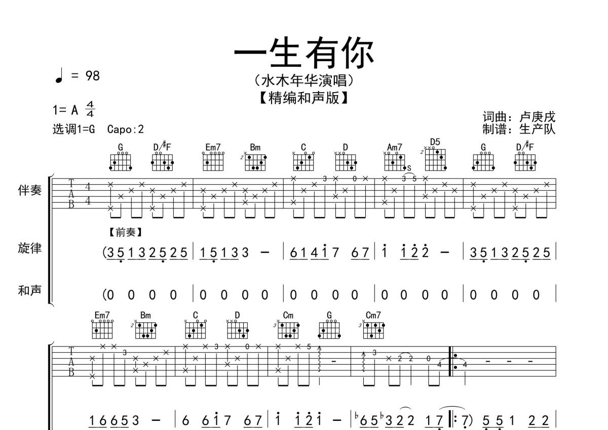 《一生有你》是水木年华演唱的一首歌曲,精编和声版,拍号为4/4拍,歌曲速度为每分钟98拍,歌曲原调为A调,但由于原调指法比较难,为了方便弹奏,本吉他谱采用的是G调指法编配,变调夹2品弹奏即为原调,当然也可以根据自己的音域改变变调夹位置,或者通过改变和弦调性,以方便自己弹奏,这份吉他谱共有四张高清图谱,图谱由 @生产队 编配上传,图谱使用六线谱编配,包含吉他和弦指法、简谱以及歌词部分,使用这份一生有你吉他谱,可以让你更加方便地掌握这首歌曲的弹唱技巧,快来尝试吧。