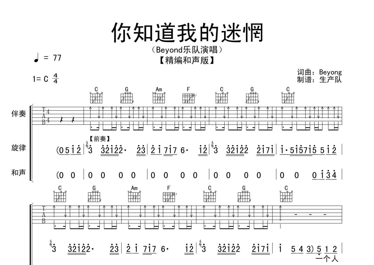 《你知道我的迷惘》是beyond演唱的一首歌曲,精编和声版,拍号为4/4拍,歌曲速度为每分钟77拍,歌曲原调为C调,本吉他谱采用的是C调指法编配,演奏时不需要使用变调夹即为原调,这份吉他谱共有四张高清图谱,图谱由 @生产队 编配上传,图谱使用六线谱编配,包含吉他和弦指法、简谱以及歌词部分,使用这份你知道我的迷惘吉他谱,可以让你更加方便地掌握这首歌曲的弹唱技巧,快来尝试吧。