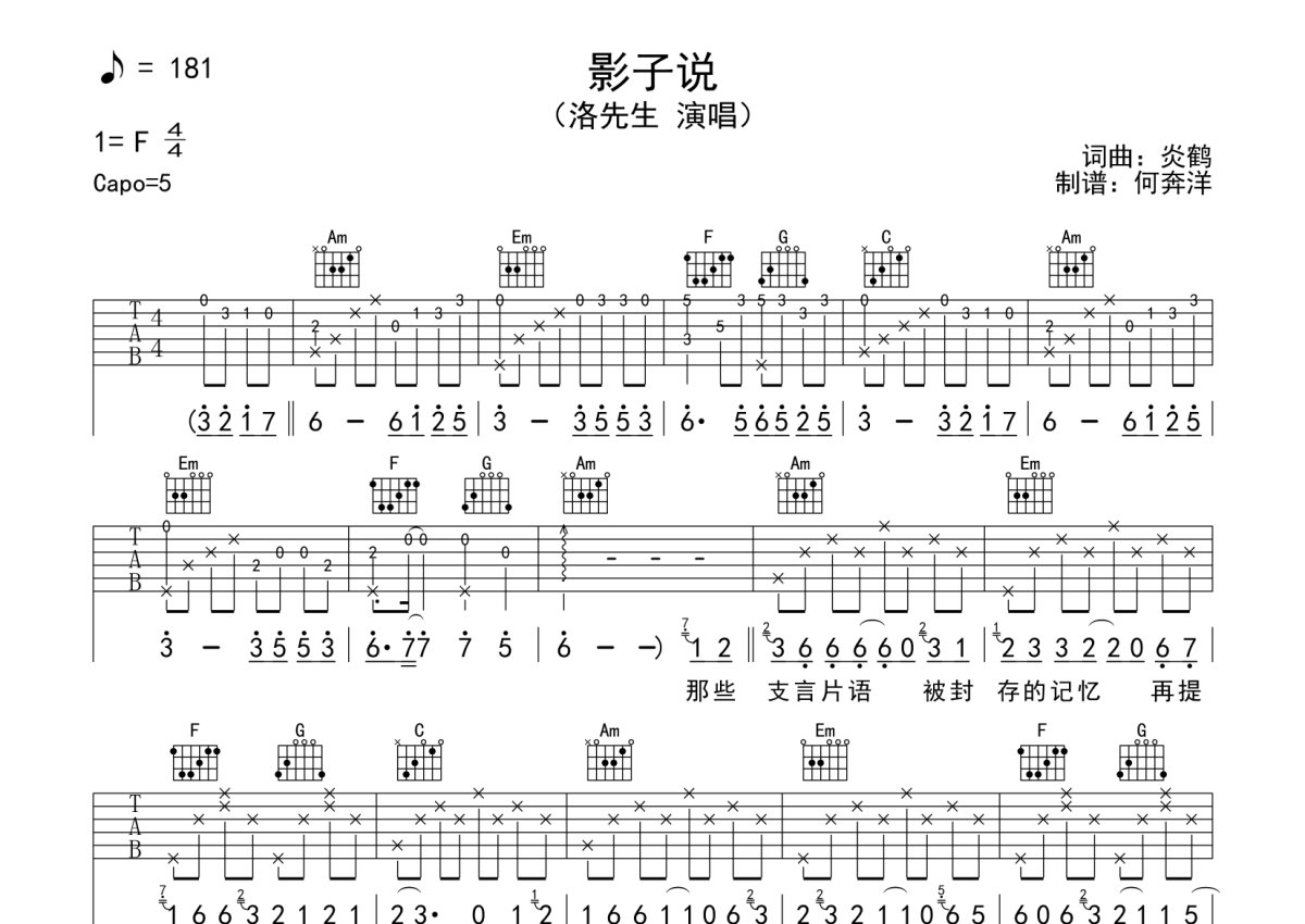 《影子说》是洛先生演唱的一首歌曲,本吉他谱采用的是C调指法编配,这份吉他谱共有两张高清图谱,图谱由 @何奔洋 编配上传,图谱使用六线谱编配,包含吉他和弦指法、简谱以及歌词部分,曲谱配备了相关的音频提供试听,使用这份影子说吉他谱,可以让你更加方便地掌握这首歌曲的弹唱技巧,快来尝试吧。洛先生《影子说》吉他谱_C调吉他弹唱谱。