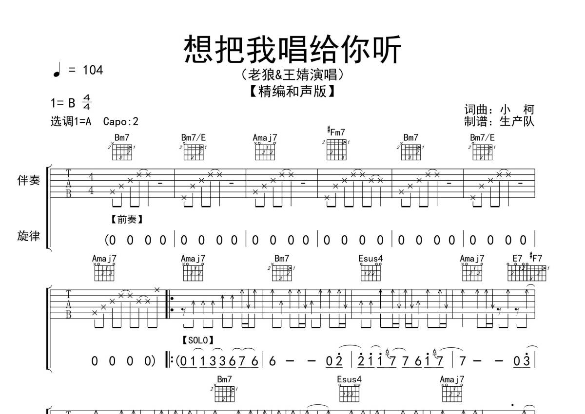 《想把我唱给你听》是老狼/王婧演唱的一首歌曲,精编和声版,拍号为4/4拍,歌曲速度为每分钟104拍,歌曲原调为B调,但由于原调指法比较难,为了方便弹奏,本吉他谱采用的是A调指法编配,变调夹2品弹奏即为原调,当然也可以根据自己的音域改变变调夹位置,或者通过改变和弦调性,以方便自己弹奏,这份吉他谱共有五张高清图谱,图谱由 @生产队 编配上传,图谱使用六线谱编配,包含吉他和弦指法、简谱以及歌词部分,使用这份想把我唱给你听吉他谱,可以让你更加方便地掌握这首歌曲的弹唱技巧,快来尝试吧。