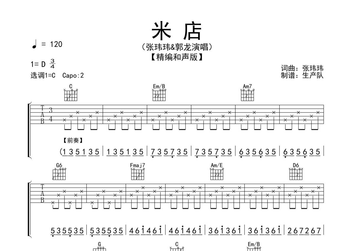 《米店》是李志演唱的一首歌曲,精编和声版,拍号为3/4拍,歌曲速度为每分钟120拍,歌曲原调为D调,但由于原调指法比较难,为了方便弹奏,本吉他谱采用的是C调指法编配,变调夹2品弹奏即为原调,当然也可以根据自己的音域改变变调夹位置,或者通过改变和弦调性,以方便自己弹奏,这份吉他谱共有四张高清图谱,图谱由 @生产队 编配上传,图谱使用六线谱编配,包含吉他和弦指法、简谱以及歌词部分,使用这份米店吉他谱,可以让你更加方便地掌握这首歌曲的弹唱技巧,快来尝试吧。