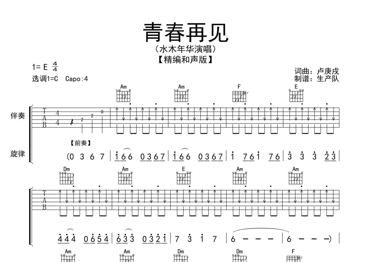 《青春再见》是水木年华演唱的一首歌曲,和声版,拍号为4/4拍,歌曲原调为E调,但由于原调指法比较难,为了方便弹奏,本吉他谱采用的是C调指法编配,变调夹4品弹奏即为原调,当然也可以根据自己的音域改变变调夹位置,或者通过改变和弦调性,以方便自己弹奏,这份吉他谱共有四张高清图谱,图谱由 @生产队 编配上传,图谱使用六线谱编配,包含吉他和弦指法、简谱以及歌词部分,使用这份青春再见吉他谱,可以让你更加方便地掌握这首歌曲的弹唱技巧,快来尝试吧。