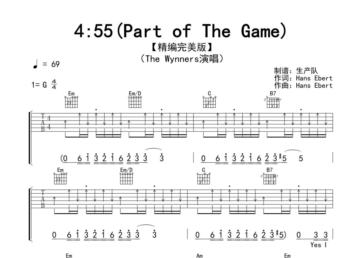 《4:55(Part Of The Game)》是The Wynners演唱的一首歌曲,拍号为4/4拍,歌曲速度为每分钟69拍,歌曲原调为G调,本吉他谱采用的是G调指法编配,演奏时不需要使用变调夹即为原调,这份吉他谱共有四张高清图谱,图谱由 @生产队 编配上传,图谱使用六线谱编配,包含吉他和弦指法、简谱以及歌词部分,使用这份4:55(Part Of The Game)吉他谱,可以让你更加方便地掌握这首歌曲的弹唱技巧,快来尝试吧。