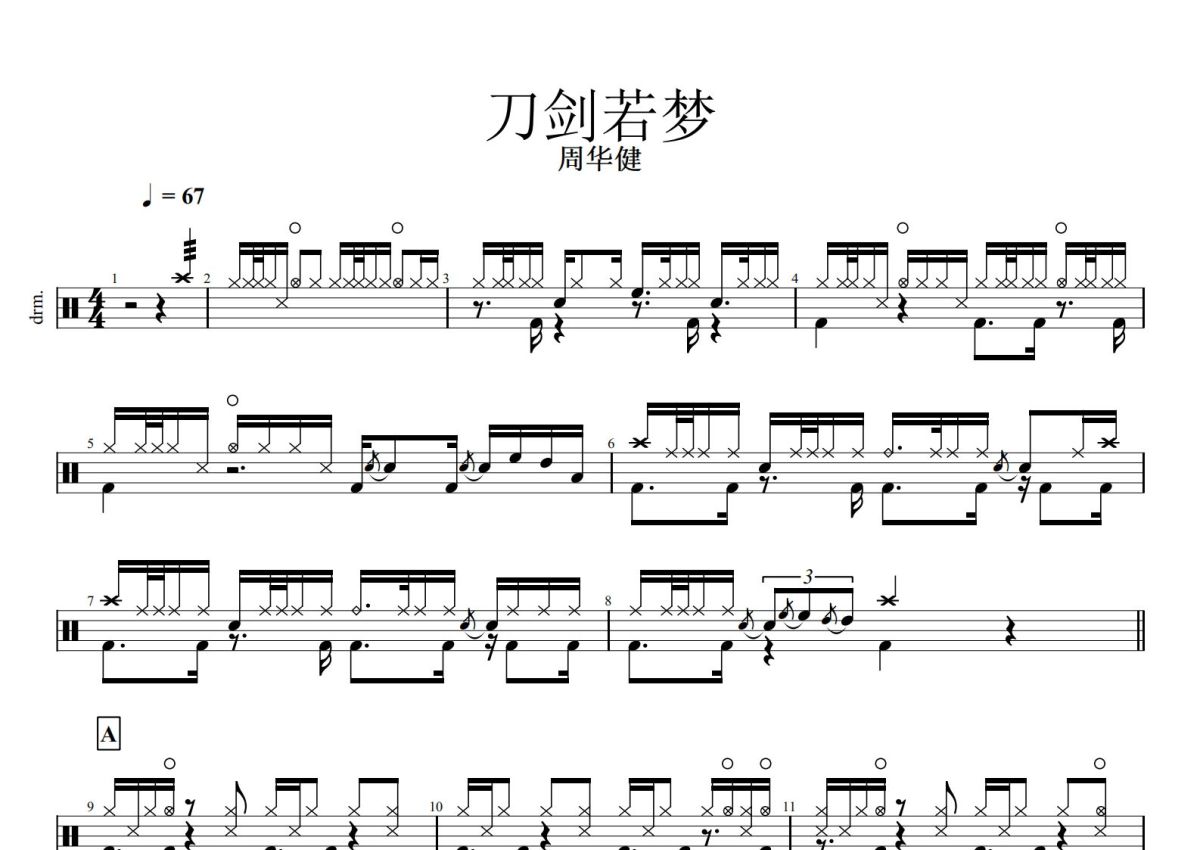 《刀剑如梦》是周华健演唱的一首歌曲,这份鼓谱共有三张高清图谱,图谱由 @打鼓谱 编配上传,图谱使用五线谱编配,使用这份刀剑如梦架子鼓谱,你将能够轻松地敲打出这首周华健的刀剑如梦,快来尝试吧。刀剑若梦(《刀剑如梦》粤语版),歌手是周华健,作词是林夕,作曲是周华健,收录于专辑《有弦相聚》 [1] 中,发行公司是滚石唱片。