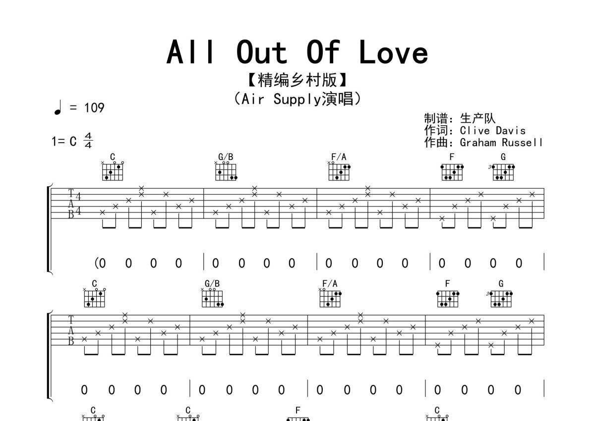《All Out Of Love》是Air Supply演唱的一首歌曲,拍号为4/4拍,歌曲速度为每分钟109拍,歌曲原调为C调,本吉他谱采用的是C调指法编配,演奏时不需要使用变调夹即为原调,这份吉他谱共有四张高清图谱,图谱由 @生产队 编配上传,图谱使用六线谱编配,包含吉他和弦指法、简谱以及歌词部分,使用这份All Out Of Love吉他谱,可以让你更加方便地掌握这首歌曲的弹唱技巧,快来尝试吧。