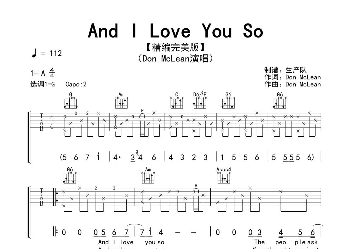 《And I Love You So》是Don Mclean演唱的一首歌曲,拍号为4/4拍,歌曲速度为每分钟112拍,歌曲原调为A调,但由于原调指法比较难,为了方便弹奏,本吉他谱采用的是G调指法编配,变调夹2品弹奏即为原调,当然也可以根据自己的音域改变变调夹位置,或者通过改变和弦调性,以方便自己弹奏,这份吉他谱共有三张高清图谱,图谱由 @生产队 编配上传,图谱使用六线谱编配,包含吉他和弦指法、简谱以及歌词部分,使用这份And I Love You So吉他谱,可以让你更加方便地掌握这首歌曲的弹唱技巧,快来尝试吧。