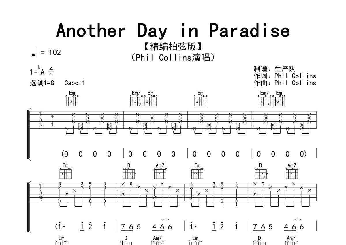 《Another Day in Paradise》是Phil Collins演唱的一首歌曲,拍号为4/4拍,歌曲速度为每分钟102拍,歌曲原调为Ab调,但由于原调指法比较难,为了方便弹奏,本吉他谱采用的是G调指法编配,变调夹1品弹奏即为原调,当然也可以根据自己的音域改变变调夹位置,或者通过改变和弦调性,以方便自己弹奏,这份吉他谱共有四张高清图谱,图谱由 @生产队 编配上传,图谱使用六线谱编配,包含吉他和弦指法、简谱以及歌词部分,使用这份Another Day in Paradise吉他谱,可以让你更加方便地掌握这首歌曲的弹唱技巧,快来尝试吧。