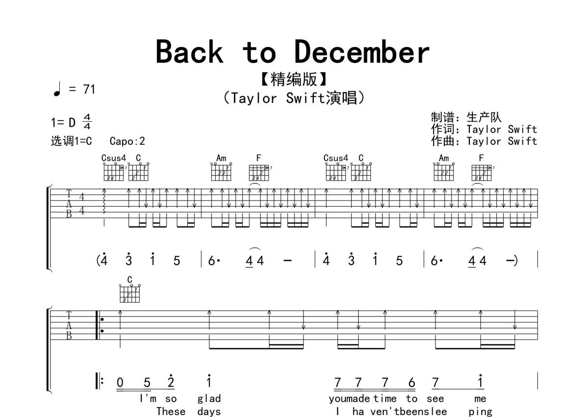 《Back to December》是Taylor Swift演唱的一首歌曲,拍号为4/4拍,歌曲速度为每分钟71拍,歌曲原调为D调,但由于原调指法比较难,为了方便弹奏,本吉他谱采用的是C调指法编配,变调夹2品弹奏即为原调,当然也可以根据自己的音域改变变调夹位置,或者通过改变和弦调性,以方便自己弹奏,这份吉他谱共有五张高清图谱,图谱由 @生产队 编配上传,图谱使用六线谱编配,包含吉他和弦指法、简谱以及歌词部分,使用这份Back to December吉他谱,可以让你更加方便地掌握这首歌曲的弹唱技巧,快来尝试吧。