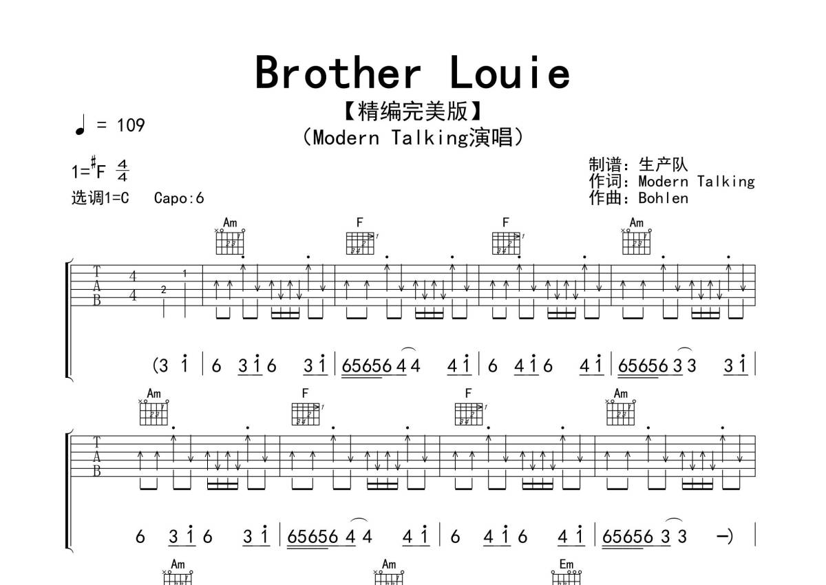 《Brother Louie》是Modern Talking演唱的一首歌曲,拍号为4/4拍,歌曲速度为每分钟109拍,歌曲原调为Gb调,但由于原调指法比较难,为了方便弹奏,本吉他谱采用的是C调指法编配,变调夹6品弹奏即为原调,当然也可以根据自己的音域改变变调夹位置,或者通过改变和弦调性,以方便自己弹奏,这份吉他谱共有四张高清图谱,图谱由 @生产队 编配上传,图谱使用六线谱编配,包含吉他和弦指法、简谱以及歌词部分,使用这份Brother Louie吉他谱,可以让你更加方便地掌握这首歌曲的弹唱技巧,快来尝试吧。