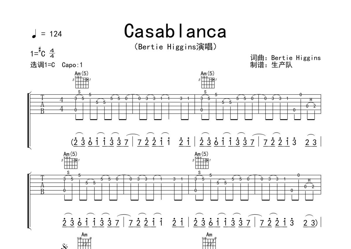 《Casablanca》是Bertie Higgins演唱的一首歌曲,拍号为4/4拍,歌曲速度为每分钟124拍,歌曲原调为Db调,但由于原调指法比较难,为了方便弹奏,本吉他谱采用的是C调指法编配,变调夹1品弹奏即为原调,当然也可以根据自己的音域改变变调夹位置,或者通过改变和弦调性,以方便自己弹奏,这份吉他谱共有五张高清图谱,图谱由 @生产队 编配上传,图谱使用六线谱编配,包含吉他和弦指法、简谱以及歌词部分,使用这份Casablanca吉他谱,可以让你更加方便地掌握这首歌曲的弹唱技巧,快来尝试吧。