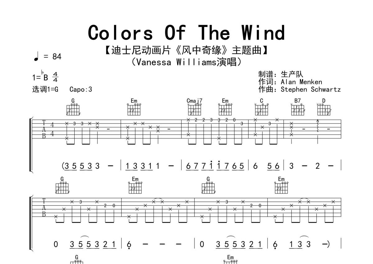 《Colors Of The Wind》是Vanessa Williams演唱的一首歌曲,拍号为4/4拍,歌曲速度为每分钟84拍,歌曲原调为Bb调,但由于原调指法比较难,为了方便弹奏,本吉他谱采用的是G调指法编配,变调夹3品弹奏即为原调,当然也可以根据自己的音域改变变调夹位置,或者通过改变和弦调性,以方便自己弹奏,这份吉他谱共有四张高清图谱,图谱由 @生产队 编配上传,图谱使用六线谱编配,包含吉他和弦指法、简谱以及歌词部分,使用这份Colors Of The Wind吉他谱,可以让你更加方便地掌握这首歌曲的弹唱技巧,快来尝试吧。