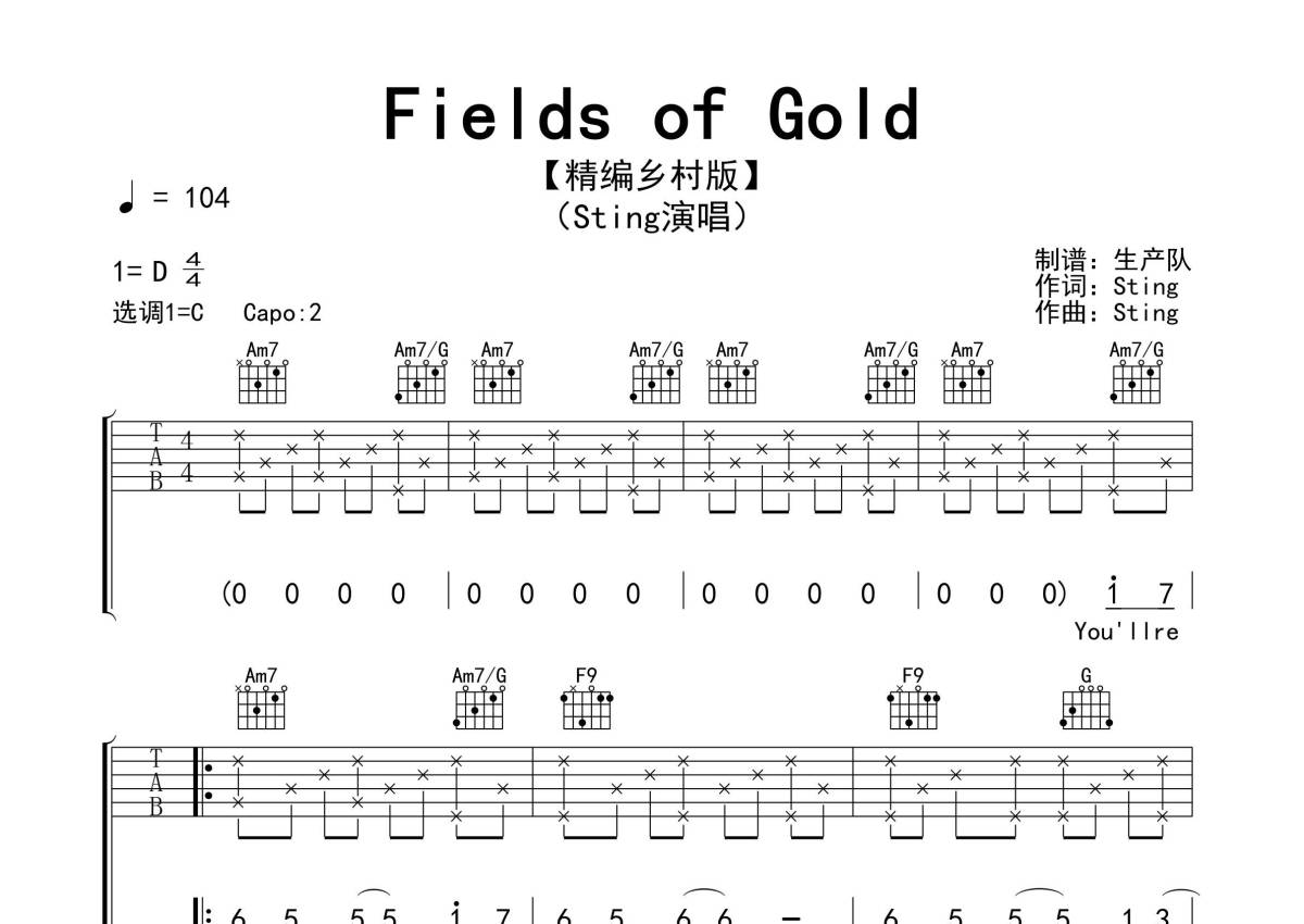 《Fields of Gold》是Sting演唱的一首歌曲,拍号为4/4拍,歌曲速度为每分钟104拍,歌曲原调为D调,但由于原调指法比较难,为了方便弹奏,本吉他谱采用的是C调指法编配,变调夹2品弹奏即为原调,当然也可以根据自己的音域改变变调夹位置,或者通过改变和弦调性,以方便自己弹奏,这份吉他谱共有四张高清图谱,图谱由 @生产队 编配上传,图谱使用六线谱编配,包含吉他和弦指法、简谱以及歌词部分,使用这份Fields of Gold吉他谱,可以让你更加方便地掌握这首歌曲的弹唱技巧,快来尝试吧。