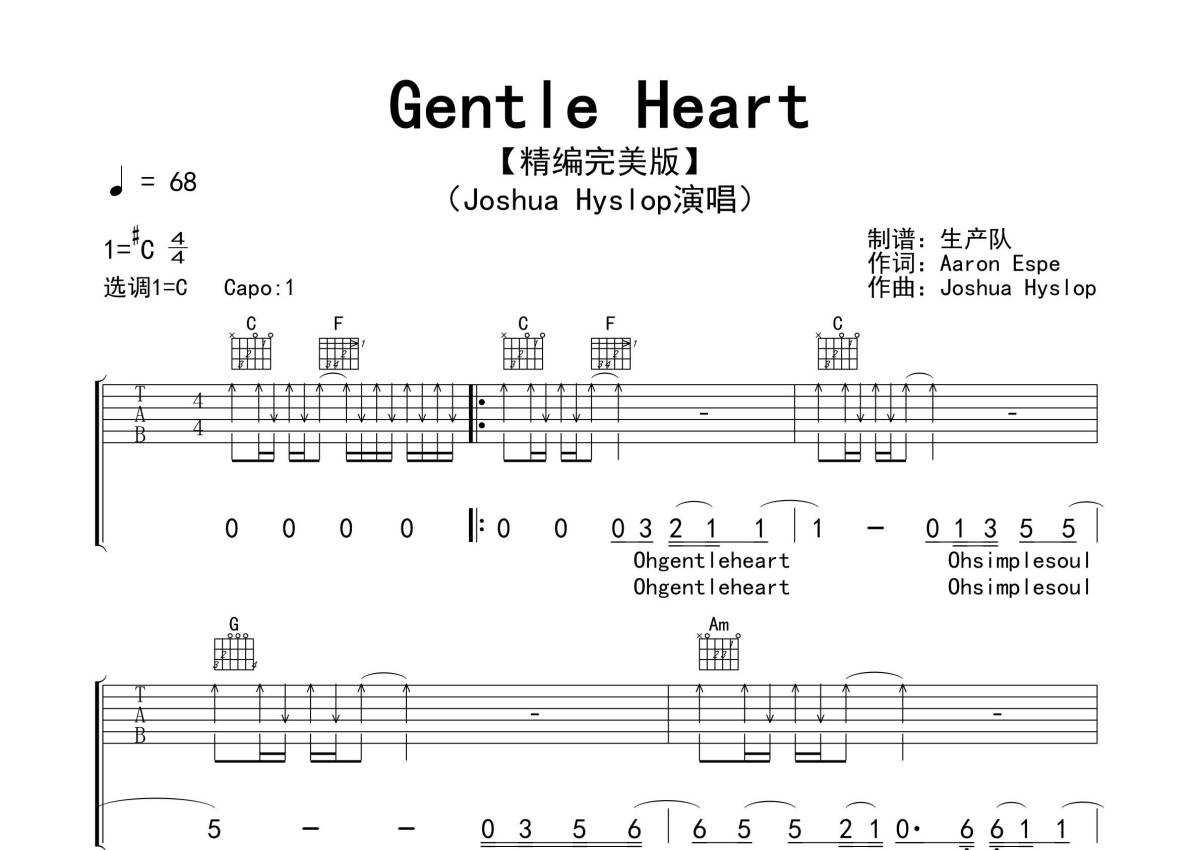 《Gentle Heart》是Joshua Hyslop演唱的一首歌曲,拍号为4/4拍,歌曲速度为每分钟68拍,歌曲原调为Db调,但由于原调指法比较难,为了方便弹奏,本吉他谱采用的是C调指法编配,变调夹1品弹奏即为原调,当然也可以根据自己的音域改变变调夹位置,或者通过改变和弦调性,以方便自己弹奏,这份吉他谱共有三张高清图谱,图谱由 @生产队 编配上传,图谱使用六线谱编配,包含吉他和弦指法、简谱以及歌词部分,使用这份Gentle Heart吉他谱,可以让你更加方便地掌握这首歌曲的弹唱技巧,快来尝试吧。