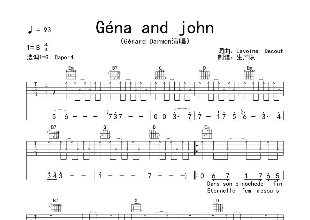 《Géna and john》是Gérard Darmon演唱的一首歌曲,拍号为4/4拍,歌曲速度为每分钟93拍,歌曲原调为B调,但由于原调指法比较难,为了方便弹奏,本吉他谱采用的是G调指法编配,变调夹4品弹奏即为原调,当然也可以根据自己的音域改变变调夹位置,或者通过改变和弦调性,以方便自己弹奏,这份吉他谱共有两张高清图谱,图谱由 @生产队 编配上传,图谱使用六线谱编配,包含吉他和弦指法、简谱以及歌词部分,使用这份Géna and john吉他谱,可以让你更加方便地掌握这首歌曲的弹唱技巧,快来尝试吧。