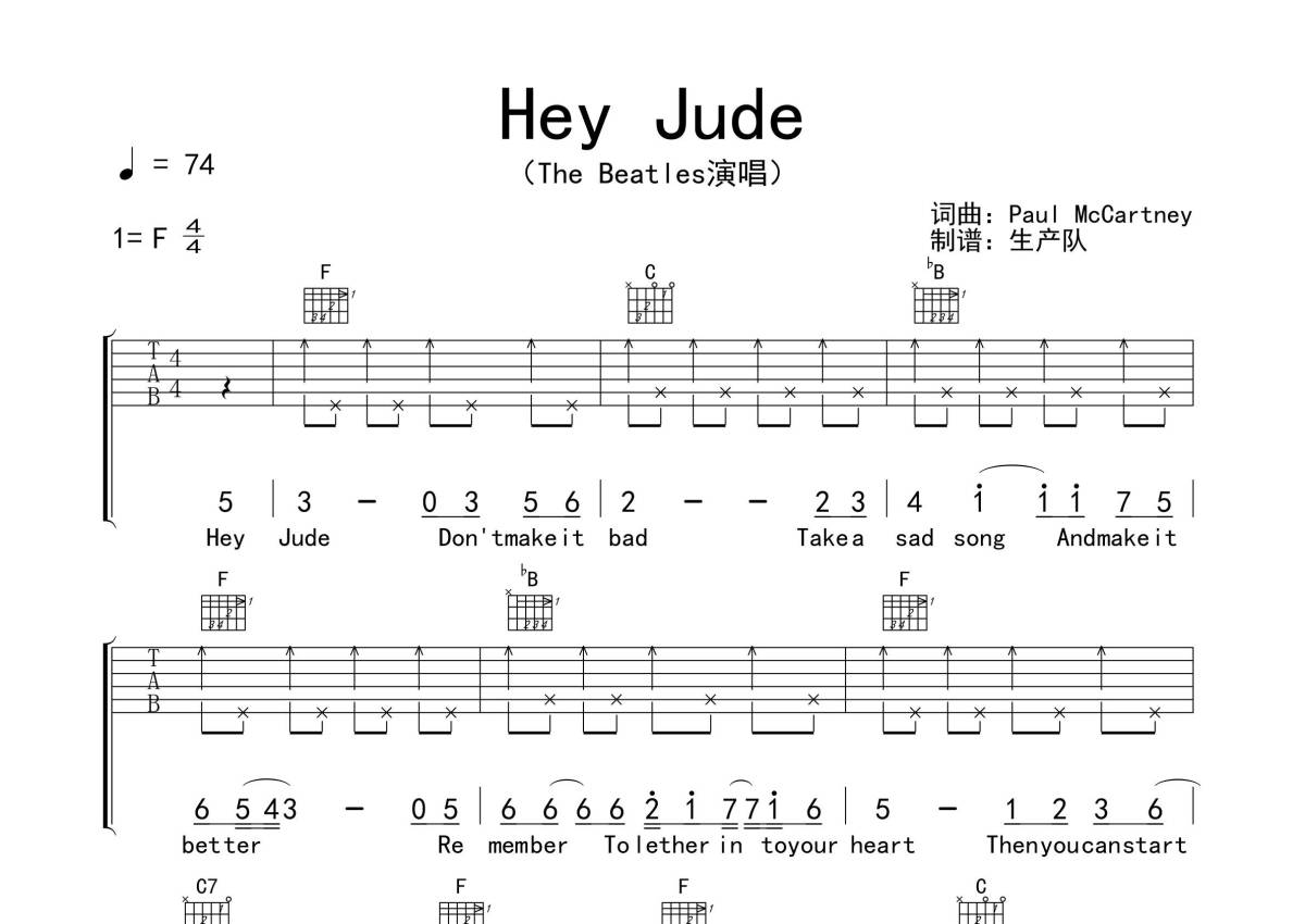 The Beatles《Hey Jude》吉他谱 - F调弹唱六线谱